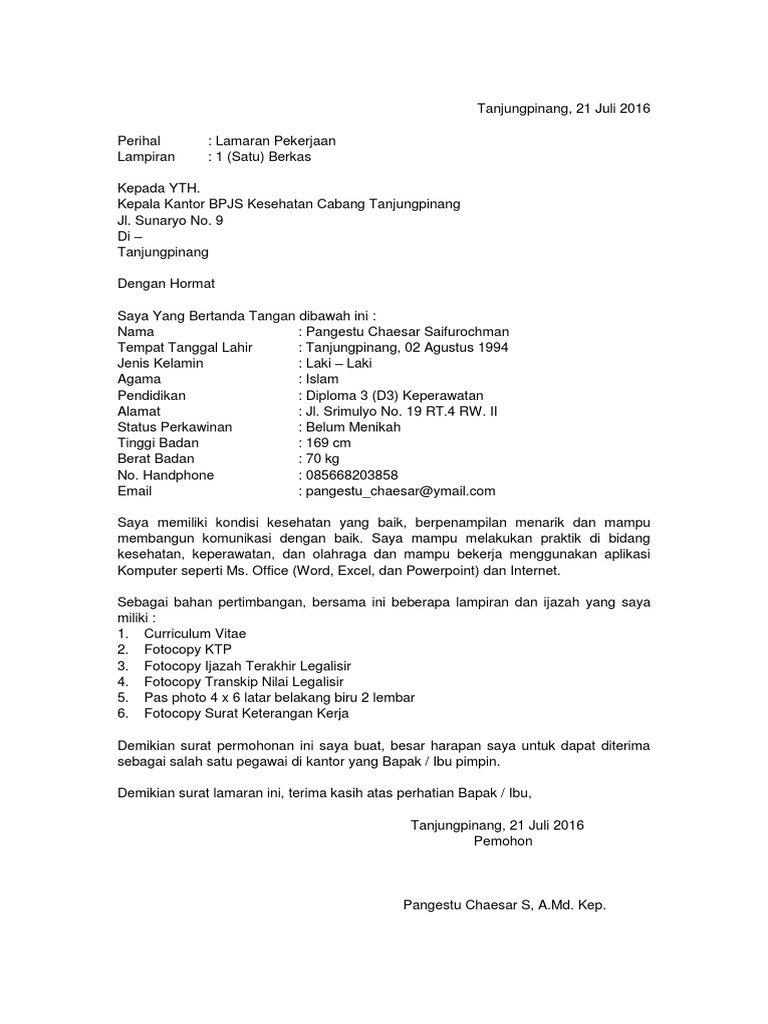 Surat lamaran kerja adalah sebuat surat yang dibuat untuk keperluan permohonan bergabung atau bekerja di sebuah perusahaan penyedia lowongan kerja. Surat lamaran kerja adalah sebuat surat yang dibuat untuk keperluan permohonan bergabung atau bekerja di sebuah perusahaan penyedia lowongan kerja. Sebagai pelamar kerja tentu ingin membuat kesan terbaik kepada hr atau user. Atas perhatian BapakIbu saya ucapkan terima kasih.