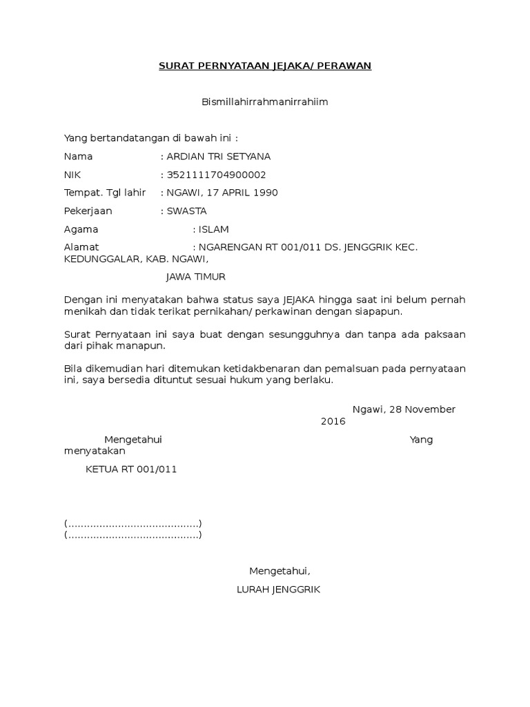 Surat ini harus dilengkapi dengan materai 6000 dan ditandatangi oleh orang yang menyatakan bahwa anak keponakan adiknya masih jejaka perawan. Contoh Surat Keterangan Belum Menikah dari RT. Mungkin yang membedakannya adalah pada isi dari surat tersebut.